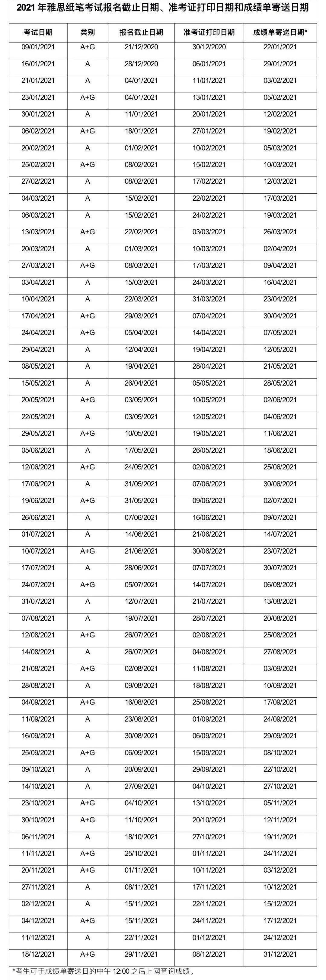 2021年雅思考试时间安排表